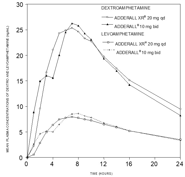 A single dose of ADDERALL XR 20 mg extended release capsules provided comparable plasma concentration profiles of both d-amphetamine and l-amphetamine to ADDERALL (immediate-release) 10 mg twice daily administered 4 hours apart.