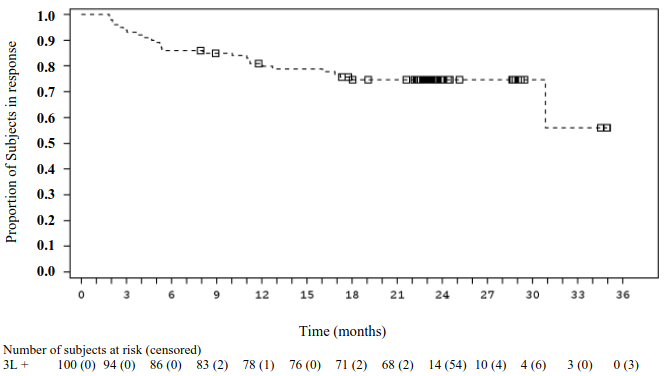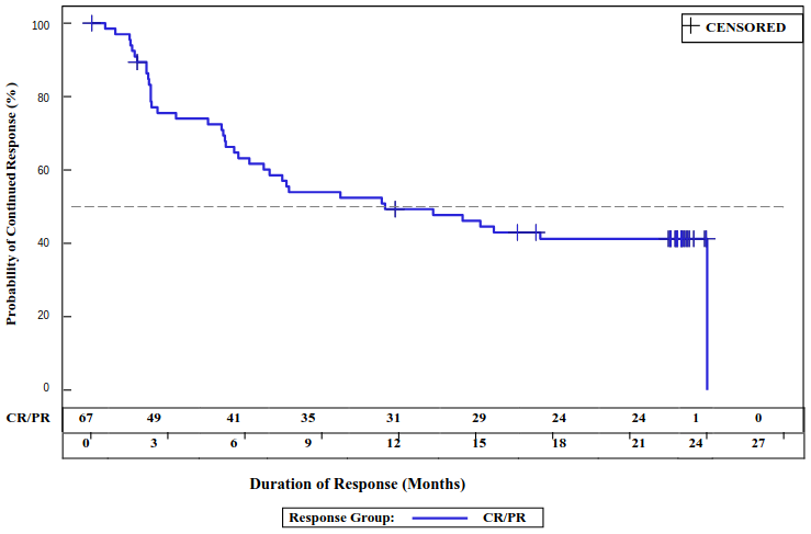 Among the 81 patients included in the efficacy set, the median time to first response (CR or PR) was 0.95 month (range: 0.7 to 3.0 months) and the median time to first CR was 0.95 month (range: 0.7 to 4.9 months). Response durations were longer in patients who achieved a BOR of CR, as compared to patients with a BOR of PR.