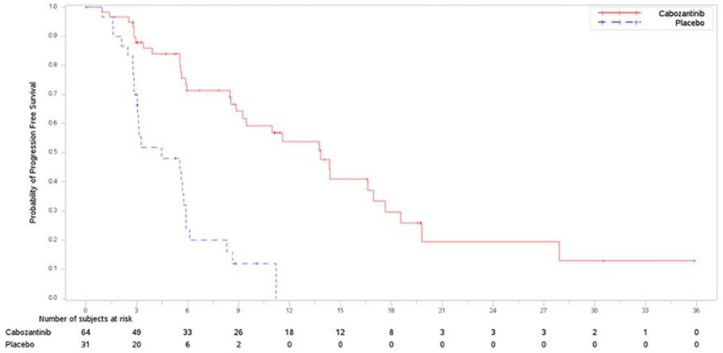 The primary analysis of PFS included 187 randomised patients, 125 to cabozantinib and 62 to placebo. Baseline demographics and disease characteristics were generally balanced for both treatment groups. The median age was 66 years (range 32 to 85 years), 51% being ≥65 years of age, 13% being ≥75 years of age. The majority of patients were white (70%), 18% of patients were Asian and 55% were female. Histologically, 55% had a confirmed diagnosis of papillary thyroid carcinoma, 48% had follicular thyroid carcinoma including 17% patients with Hürthle cell thyroid cancer. Metastases were present in 95% of the patients: lungs in 68%, lymph nodes in 67%, bone in 29%, pleura in 18% and liver in 15%. Five patients had not received prior RAI due to ineligibility, 63% had received prior lenvatinib, 60% had received prior sorafenib and 23% had received both sorafenib and lenvatinib. Baseline ECOG performance status was 0 (48%) or 1 (52%). The median duration of treatment was 4.4 months in the cabozantinib arm and 2.3 months in the placebo arm.