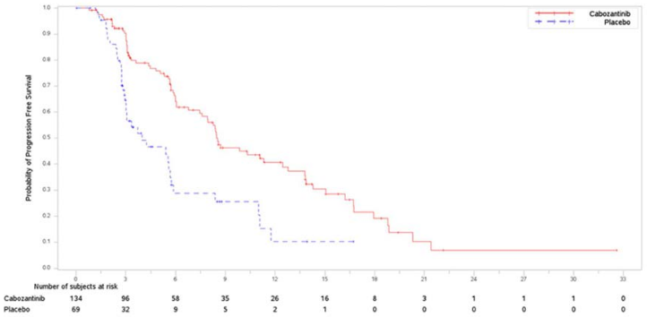 | Endpoint | Cabozantinib (N=134) | Placebo (N=69) |