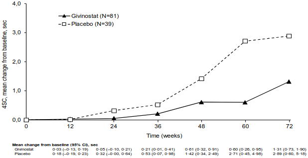The primary endpoint was met, givinostat significantly (p=0.035) reduced the decline in 4SC compared to placebo based on the prespecified log scale analysis (Table 4). When the results were analysed in non-log scale, the mean 4SC increased by 1.25 seconds in the givinostat group vs 3.03 seconds in the placebo group (see Table 4). Therefore, the treatment effect (change from baseline, givinostat minus placebo) was -1.78 seconds (p=0.037).