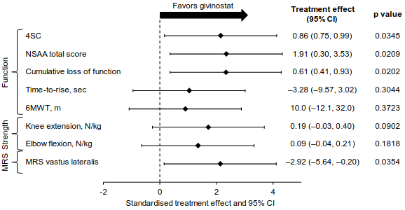 The key secondary efficacy endpoints in Group A were the change from baseline to 18 months in physical function assessed by North Star Ambulatory Assessment (NSAA), time to rise from floor (TTR); distance walked in 6 minutes (6MWT); muscle strength evaluated by knee extension and elbow flexion as measured by hand-held myometry (HHM); and fat fraction of vastus lateralis muscles evaluated by Magnetic Resonance Spectroscopy (MRS) technique. Overall, the results of the key secondary endpoints assessing function, strength and muscle morphology did not reach formal statistical significance based on the pre-specified Hochberg analysis, however all outcomes were in favour of givinostat (Figure 2).