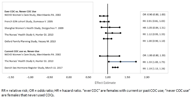 Five studies that compared breast cancer risk between ever-users (current or past use) of COCs and never-users of COCs reported no association between ever use of COCs and breast cancer risk, with effect estimates ranging from 0.90 to 1.12 (Figure 1).