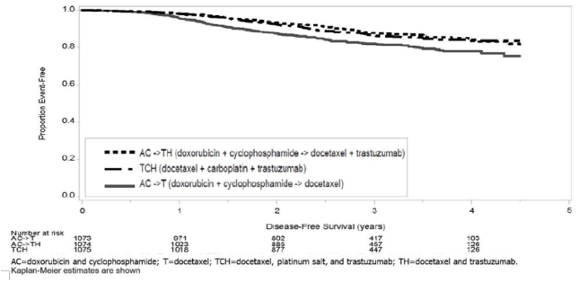 The results for DFS for the integrated analysis of Studies 1 and 2, Study 3, and Study 4 and OS results for the integrated analysis of Studies 1 and 2, and Study 3 are presented in Table 9. For Studies 1 and 2, the duration of DFS following a median follow-up of 2.0 years in the AC→TH arm is presented in Figure 4, and the duration of OS after a median follow-up of 8.3 years in the AC→TH arm is presented in Figure 5. The duration of DFS for Study 4 is presented in Figure 6. Across all four studies, at the time of definitive DFS analysis, there were insufficient numbers of patients within each of the following subgroups to determine if the treatment effect was different from that of the overall patient population: patients with low tumor grade, patients within specific ethnic/racial subgroups (Black, Hispanic, Asian/Pacific Islander patients), and patients >65 years of age. For Studies 1 and 2, the OS hazard ratio was 0.64 (95% CI: 0.55, 0.74). At 8.3 years of median follow-up [AC→TH], the survival rate was estimated to be 86.9% in the AC→TH arm and 79.4% in the AC→T arm. The final OS analysis results from Studies 1 and 2 indicate that OS benefit by age, hormone receptor status, number of positive lymph nodes, tumor size and grade, and surgery/radiation therapy was consistent with the treatment effect in the overall population. In patients ≤ 50 years of age (n = 2197), the OS hazard ratio was 0.65 (95% CI: 0.52, 0.81) and in patients > 50 years of age (n = 1866), the OS hazard ratio was 0.63 (95% CI: 0.51, 0.78). In the subgroup of patients with hormone receptor-positive disease (ER-positive and/or PR-positive) (n = 2223), the hazard ratio for OS was 0.63 (95% CI: 0.51, 0.78). In the subgroup of patients with hormone receptor-negative disease (ER-negative and PR-negative) (n = 1830), the hazard ratio for OS was 0.64 (95% CI: 0.52, 0.80). In the subgroup of patients with tumor size ≤ 2 cm (n = 1604), the hazard ratio for OS was 0.52 (95% CI: 0.39, 0.71). In the subgroup of patients with tumor size > 2 cm (n = 2448), the hazard ratio for OS was 0.67 (95% CI: 0.56, 0.80).