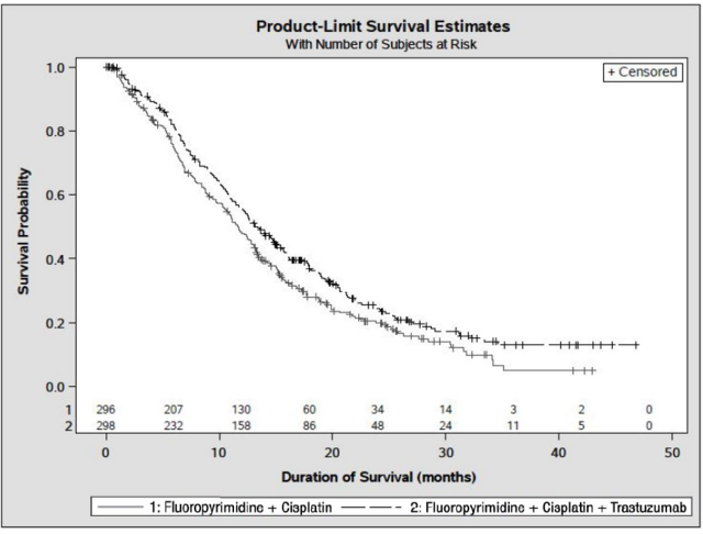 The safety and efficacy of trastuzumab in combination with cisplatin and a fluoropyrimidine (capecitabine or 5-fluorouracil) were studied in patients previously untreated for metastatic gastric or gastroesophageal junction adenocarcinoma (Study 7). In this open-label, multi-center trial, 594 patients were randomized 1:1 to trastuzumab in combination with cisplatin and a fluoropyrimidine (FC+H) or chemotherapy alone (FC). Randomization was stratified by extent of disease (metastatic vs. locally advanced), primary site (gastric vs. gastroesophageal junction), tumor measurability (yes vs. no), ECOG performance status (0, 1 vs. 2), and fluoropyrimidine (capecitabine vs. 5-fluorouracil). All patients were either HER2 gene amplified (FISH+) or HER2 overexpressing (IHC 3+). Patients were also required to have adequate cardiac function (e.g., LVEF > 50%).