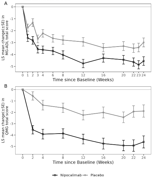 Over time, a higher proportion of patients achieved sustained MG-ADL (improvement >2 points from Week 2 through Week 24) and QMG (improvement >3 points from Week 2 through Week 24) responses in the nipocalimab group (45.5% and 33.8%, respectively) compared to the placebo group (21.1% and 7.9%, respectively).