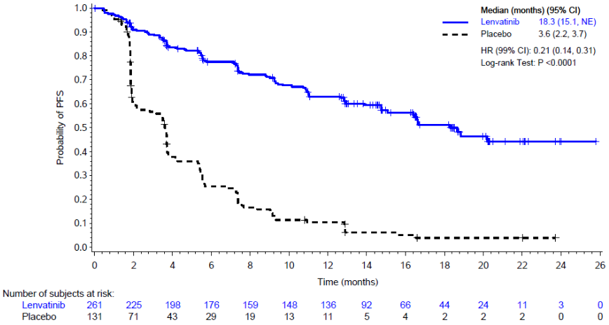 A statistically significant prolongation in PFS was demonstrated in lenvatinib-treated patients compared with those receiving placebo (p<0.0001) (see figure 1). The positive effect on PFS was seen across the subgroups of age (above or below 65 years), sex, race, histological subtype, geographic region, and those who received 0 or 1 prior VEGF/VEGFR-targeted therapies. Following independent review confirmation of disease progression, 109 (83.2%) patients randomised to placebo had crossed over to open-label lenvatinib at the time of the primary efficacy analysis.