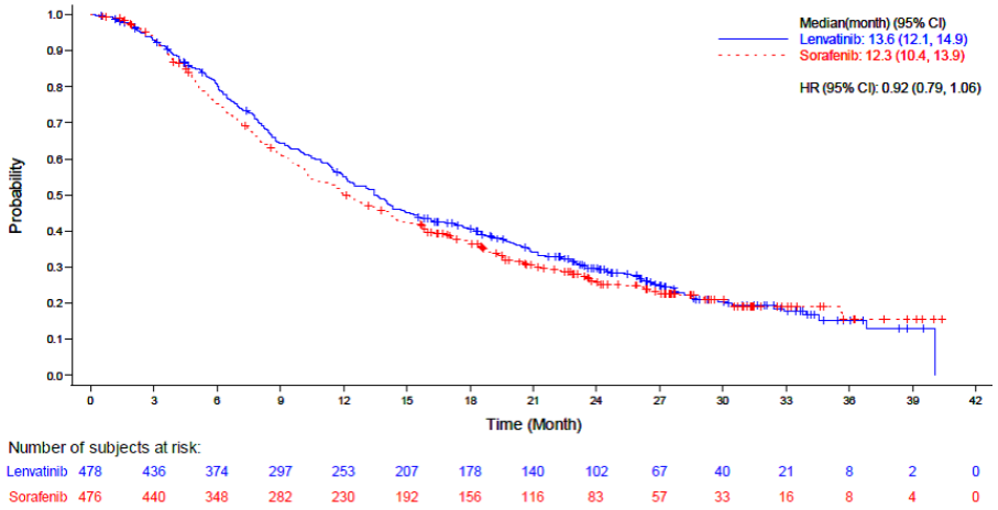 The primary efficacy endpoint was Overall Survival (OS). Lenvatinib was non-inferior for OS to sorafenib with HR = 0.92 [95% CI of (0.79, 1.06)] and a median OS of 13.6 months vs 12.3 months (see Table 8 and Figure 2). The results for surrogate endpoints (PFS and ORR) are presented in Table 8 below.
