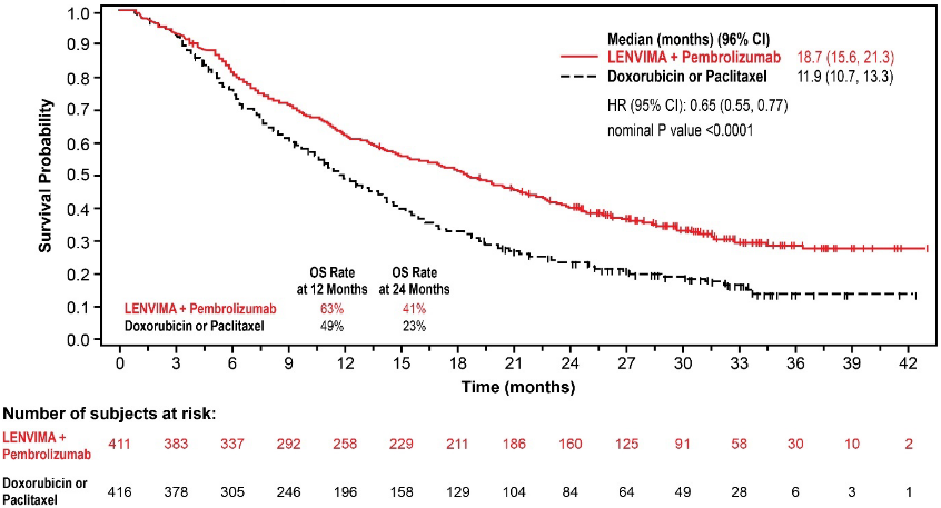b One-sided nominal p-Value based on stratified log-rank test (final analysis). At the pre-specified interim analysis of OS with a median follow-up time of 11.4 months (range:0.3 to 26.9 months), statistically significant superiority was achieved for OS comparing the combination of lenvatinib and pembrolizumab with doxorubicin or paclitaxel (HR: 0.62 [95%CI: 0.51, 0.75] p-Value <0.0001).