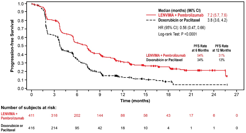 | Endpoint | LENVIMA with pembrolizumab N=411 | Doxorubicin or Paclitaxel N=416 |