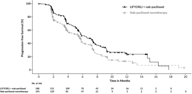 LIFYORLI demonstrated a statistically significant improvement in PFS and OS for patients randomized to LIFYORLI in combination with nab-paclitaxel compared to nab-paclitaxel monotherapy.
