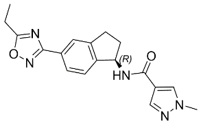 The chemical name of aficamten is (R)-N-(5-(5-ethyl-1,2,4-oxadiazol-3-yl)-2,3-dihydro-1H-inden-1-yl)-1-methyl-1H-pyrazole-4-carboxamide. The molecular formula is C18H19N5O2 and the molecular weight is 337.38 g/mol.
