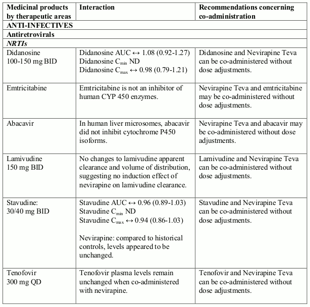Compounds using this metabolic pathway may have decreased plasma concentrations when co- administered with nevirapine. Careful monitoring of the therapeutic effectiveness of P450 metabolised medicinal products is recommended when taken in combination with nevirapine.