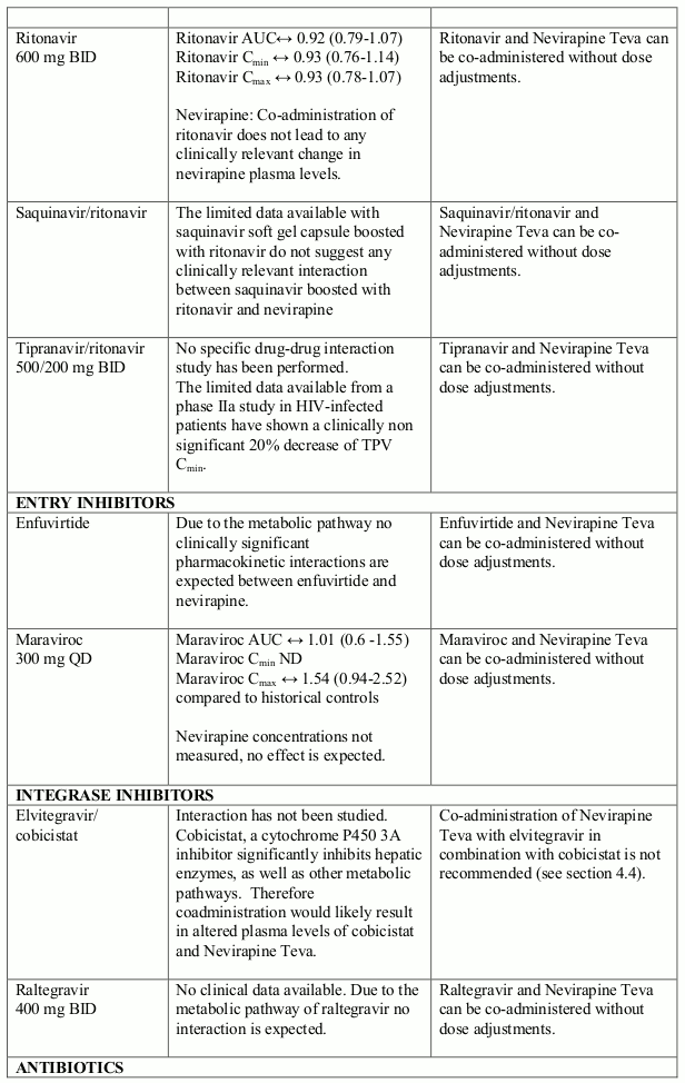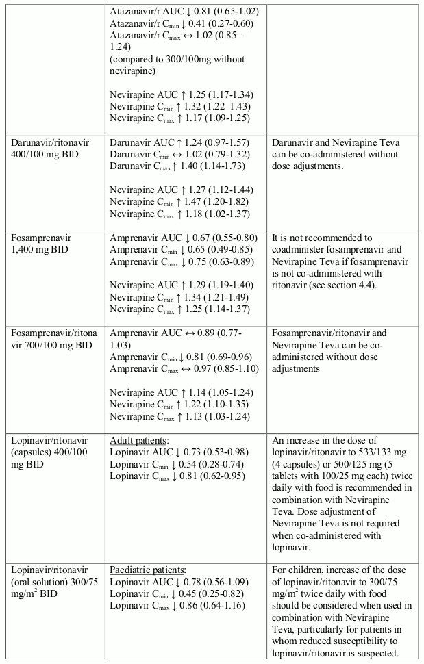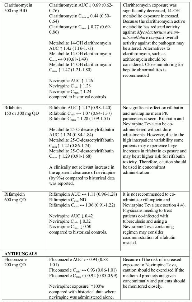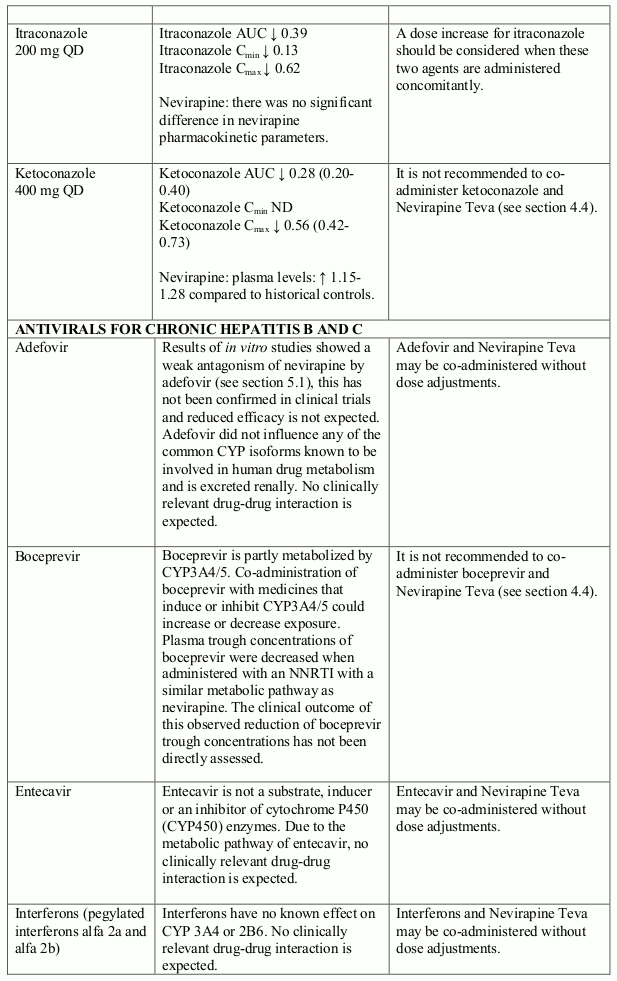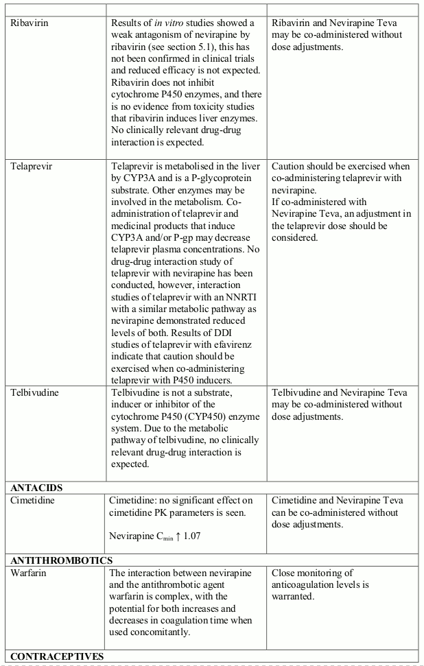 The available pharmacokinetic data suggest that the concomitant use of rifampicin and nevirapine is not recommended. Furthermore, combining the following compounds with Nevirapine Teva is not recommended: efavirenz, ketoconazole, delavirdine, etravirine, rilpivirine, elvitegravir (in combination with cobicistat), atazanavir (in combination with ritonavir), boceprevir; fosamprenavir (if not co-administered with low dose ritonavir) (see section 4.5).