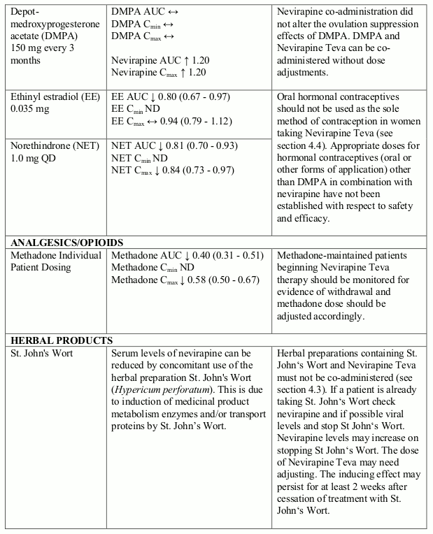 Hormonal methods of birth control other than Depot-medroxyprogesterone acetate (DMPA) should not be used as the sole method of contraception in women taking Nevirapine Teva, since nevirapine might lower the plasma concentrations of these medicinal products. For this reason, and to reduce the risk of HIV transmission, barrier contraception (e.g. condoms) is recommended. Additionally, when postmenopausal hormone therapy is used during administration of nevirapine, its therapeutic effect should be monitored.