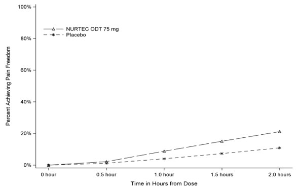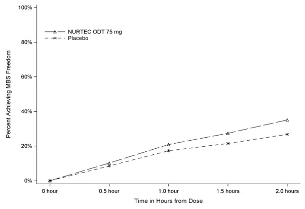 In Study 1, the percentage of patients achieving headache pain freedom and MBS freedom two hours after a single dose was statistically significantly greater in patients who received NURTEC ODT compared to those who received placebo (Table 1).