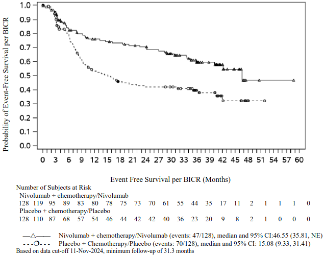 Baseline characteristics in the ITT population were generally balanced across treatment groups. The median age was 65 years (range: 34-84) with 51% of patients ≥65 years and 7% of patients ≥75 years; 50% of patients were Asian, 47% were white, and 71% were male. Baseline ECOG performance status was 0 (67%) or 1 (33%); 50% of patients with PD-L1 ≥1% and 43% with PD-L1 <1%; 5% had Stage IB, 17% had Stage IIA, 13% had Stage IIB, and 64% had Stage IIIA disease; 51% had squamous and 49% had non-squamous histology; and 89% were former/current smokers. Definitive surgery was performed on 83% of the patients in the nivolumab in combination with chemotherapy arm and on 75% of the patients in the chemotherapy arm. Adjuvant systemic treatment was received by 14.8% of patients in the nivolumab in combination with chemotherapy arm and by 25% of patients in the chemotherapy arm.