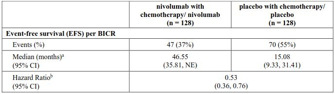 At the final pCR analysis and pre-specified interim EFS analysis (minimum follow-up 21 months), in all randomised patients, a statistically significant improvement was demonstrated in pCR and EFS for patients randomised to nivolumab in combination with chemotherapy as compared to chemotherapy alone. The pCR response rate was 24% in the nivolumab in combination with chemotherapy arm and 2.2% in the chemotherapy arm (difference of pCR 21.6, 99% CI: 13.0, 30.3; odds ratio of pCR 13.9, 99% CI: 3.49, 55.75; stratified p-value <0.0001). Median EFS was 31.6 months in the nivolumab in combination with chemotherapy arm and 20.8 months in the chemotherapy arm (HR = 0.63, 97.38% CI: 0.43, 0.91; stratified log-rank p-value 0.0052). At a pre-specified interim analysis, the HR for OS (minimum follow up 21 months) was 0.57 (99.67% CI: 0.30, 1.07) for nivolumab in combination with chemotherapy vs. chemotherapy.
