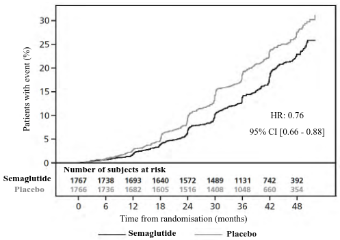 The primary endpoint was time from randomisation to first occurrence of a major adverse cardiovascular event (MACE): cardiovascular death, non-fatal myocardial infarction or non-fatal stroke. The total number of primary component MACE endpoints was 254, including 108 (6.6%) with semaglutide and 146 (8.9%) with placebo. See figure 4 for results on primary and secondary cardiovascular endpoints. Treatment with semaglutide resulted in a 26% risk reduction in the primary composite outcome of death from cardiovascular causes, non-fatal myocardial infarction or non-fatal stroke. The total numbers of cardiovascular deaths, non-fatal myocardial infarctions and non-fatal strokes were 90, 111, and 71, respectively, including 44 (2.7%), 47 (2.9%), and 27 (1.6%), respectively, with semaglutide (figure 4). The risk reduction in the primary composite outcome was mainly driven by decreases in the rate of non-fatal stroke (39%) and non-fatal myocardial infarction (26%) (figure 3).