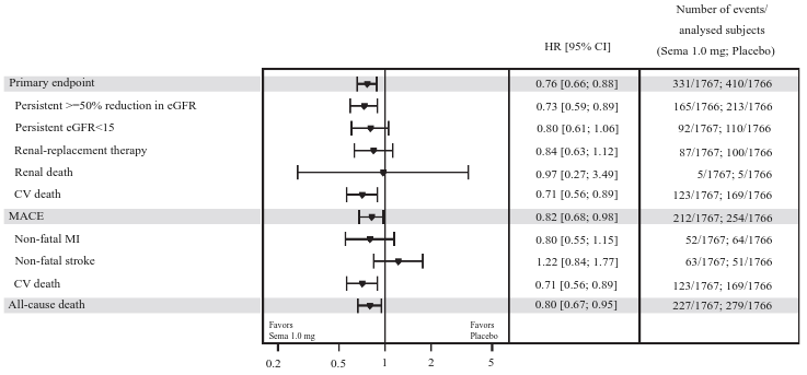 Semaglutide showed superiority over placebo, in addition to standard-of-care, in reducing the yearly rate of change in eGFR with an estimated treatment difference of 1.16 (ml/min/1.73m²/year) [0.86; 1.47] 95% CI. Treatment with semaglutide improved overall survival with a significant reduction in all-cause mortality (see Figure 6).