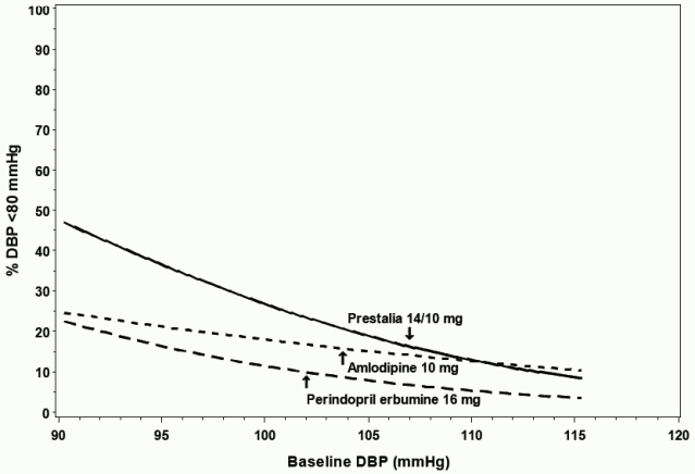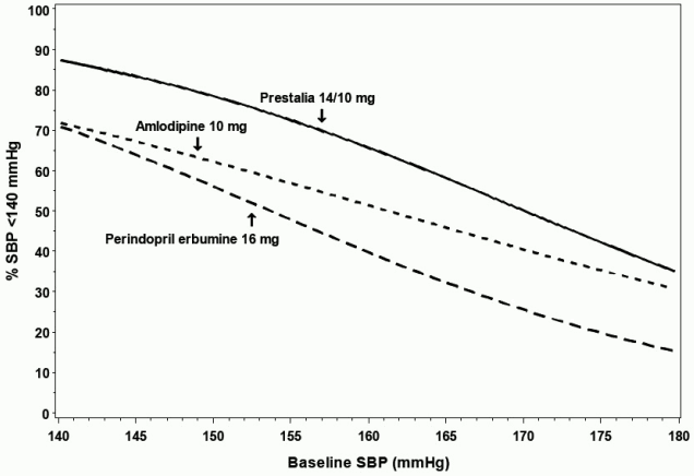 For example, a patient with a baseline blood pressure of 170/105 mmHg has approximately a 26% likelihood of achieving a goal of <140 mmHg (systolic) and 31% likelihood of achieving <90 mmHg (diastolic) on perindopril erbumine 16 mg. The likelihood of achieving these same goals on amlodipine 10 mg is approximately 40% (systolic) and 46% (diastolic). These likelihoods rise to 50% (systolic) and 65% (diastolic) with PRESTALIA 14/10 mg.