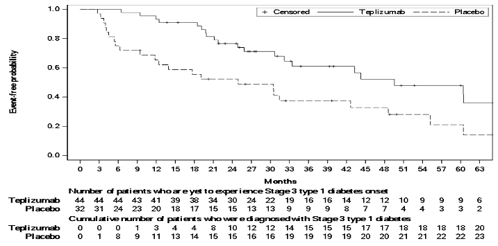 In study TN-10, stage 3 T1D was diagnosed in 20 (45%) of the patients treated with teplizumab and in 23 (72%) of the patients treated with placebo. A Cox proportional hazards model, stratified by age and oral glucose tolerance test status at randomisation, showed that the median time from randomisation to stage 3 T1D diagnosis was 50 months in the teplizumab group and 25 months in the placebo group, for a difference of 25 months. With a median follow-up time of 51 months, therapy with teplizumab resulted in a statistically significant delay in the development of stage 3 T1D, hazard ratio 0.41 (95% CI: 0.22 to 0.78; p=0.0066) (Figure 1).