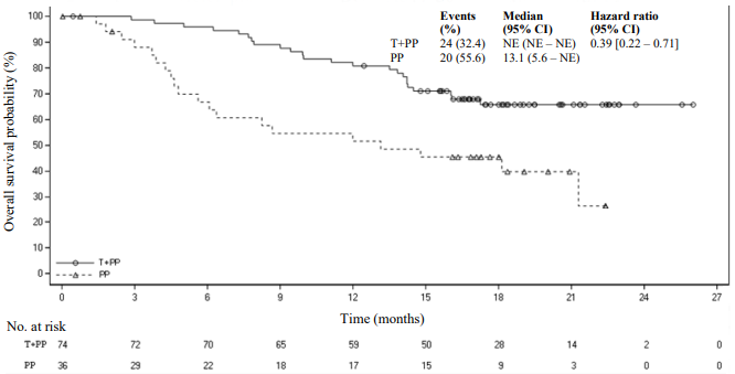 The study met its primary endpoint at the interim analysis (data cut-off date of 23-Jan-2020 and a median duration of study follow-up of 9.8 months), showing a statistically significant improvement in PFS with T+PP compared with PP. The stratified hazard ratio was 0.65 (95% CI: 0.47, 0.91; p=0.0054) with a median PFS of 9.7 months with T+PP and 7.6 months with PP.
