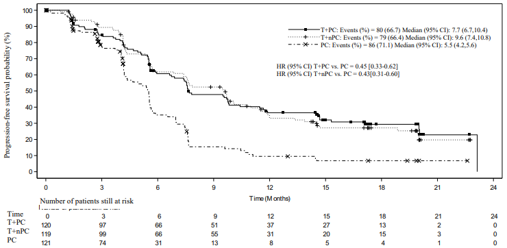 The primary efficacy endpoint was progression-free survival (PFS) as assessed by IRC per RECIST v1.1 in the ITT analysis which was to be tested sequentially in arms T+PC versus PC and arms T+nPC versus PC. The secondary efficacy endpoints included overall survival (OS), objective response rate (ORR) and duration of response (DoR) per IRC and per investigator.