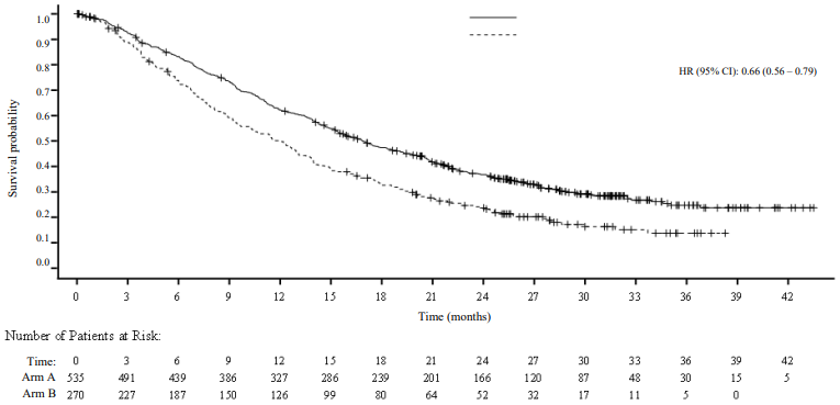 a Stratified by stratification factors: disease stage (IIIB versus IV) and PD-L1 expression in tumour cell (≥50% TC versus 1% to 49% TC versus <1% TC).