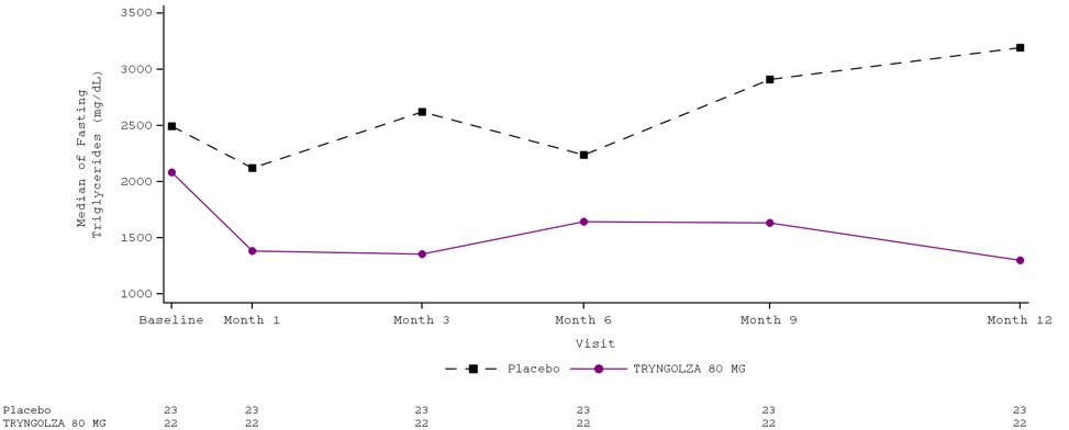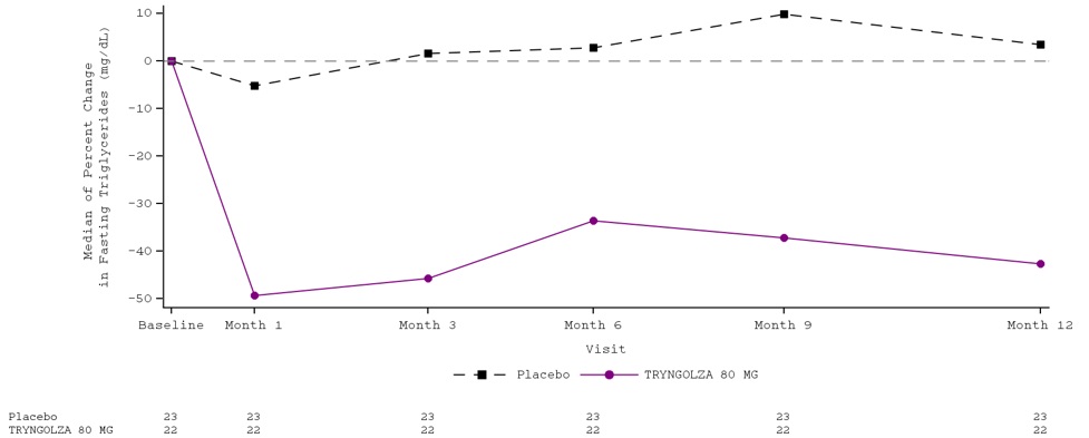 The primary endpoint was percent change in fasting triglycerides from baseline to Month 6 (average of Weeks 23, 25, and 27) compared to placebo. The difference between TRYNGOLZA 80 mg group and the placebo group in percent change in fasting triglycerides from baseline to Month 6 was -42.5% (95% CI: -74.1%, -10.9%; p=0.0084). For additional results see Table 2.