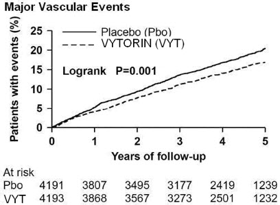 In the primary intent-to-treat analysis, 639 (15.2%) of 4193 patients initially allocated to VYTORIN and 749 (17.9%) of 4191 patients initially allocated to placebo experienced an MVE. This corresponded to a relative risk reduction of 16% (p=0.001) (see Figure 1). Similarly, 526 (11.3%) of 4650 patients ever allocated to VYTORIN and 619 (13.4%) of 4620 patients ever allocated to placebo experienced a major atherosclerotic event (MAE; a subset of the MVE composite that excluded non-coronary cardiac deaths and hemorrhagic stroke), corresponding to a relative risk reduction of 17% (p=0.002). The trial demonstrated that treatment with VYTORIN 10/20 mg versus placebo reduced the risk for MVE and MAE in this CKD population. The study design precluded drawing conclusions regarding the independent contribution of either ezetimibe or simvastatin to the observed effect.
