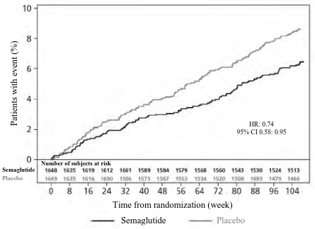 The cardiovascular safety of treatment with semaglutide 0.5 or 1 mg was confirmed as the hazard ratio (HR) for semaglutide vs. placebo was 0.74, [0.58, 0.95] [95% CI], driven by a decrease in the rate of non-fatal stroke and non-fatal myocardial infarction with no difference in cardiovascular death (see Figure 7).