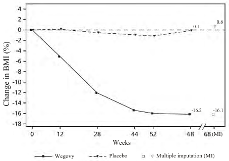 2 During the trial, randomised treatment was permanently discontinued by 10.4% and 10.4% of patients randomised to semaglutide 2.4 mg and placebo, respectively. Assuming that all randomised patients stayed on treatment and did not receive additional anti-obesity therapies, the estimated changes from randomisation to week 68 for BMI based on a Mixed Model for Repeated Measures including all observations until first discontinuation were -17.9% and 0.6% for semaglutide 2.4 mg and placebo respectively