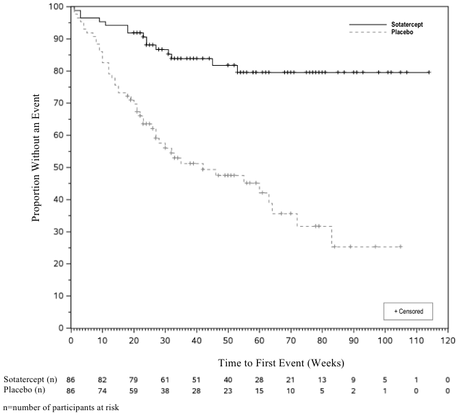 Treatment with sotatercept resulted in an 82% reduction (HR 0.182, 95% CI: 0.075, 0.441; p<0.001) in the occurrence of death or clinical worsening events compared to placebo (see Table 4). The treatment effect of sotatercept versus placebo started by Week 10 and continued for the duration of the study.