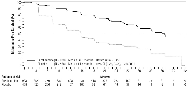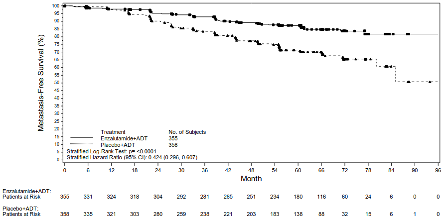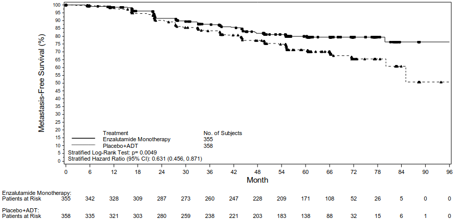 Metastasis-free survival (MFS) in patients randomised to receive enzalutamide plus ADT compared to patients randomised to receive placebo plus ADT was the primary endpoint. Metastasis-free survival was defined as the time from randomisation to radiographic progression or death on study, whichever occurred first.