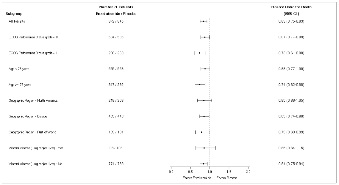 The demographic and baseline characteristics were well-balanced between the two treatment arms. The median age at randomisation was 74 years in the enzalutamide arm and 73 years in the placebo arm. Most patients (approximately 71%) in the study were Caucasian; 16% were Asian and 2% were Black. Eighty-one percent (81%) of patients had an ECOG performance status score of 0 and 19% patients had an ECOG performance status of 1.