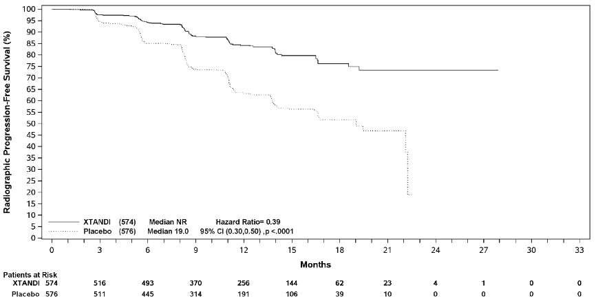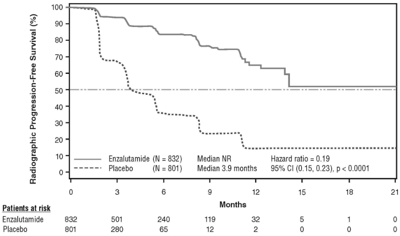 Radiographic progression-free survival as assessed by the investigator using RECIST v 1.1 for soft tissue and appearance of 2 or more bone lesions in bone scan was 8.3 months for patients treated with enzalutamide and 2.9 months for patients who received placebo [HR=0.40 (95% CI: 0.35, 0.47), p<0.0001]. The analysis involved 216 deaths without documented progression and 645 documented progression events, of which 303 (47%) were due to soft tissue progression, 268 (42%) were due to bone lesion progression and 74 (11%) were due to both soft tissue and bone lesions.
