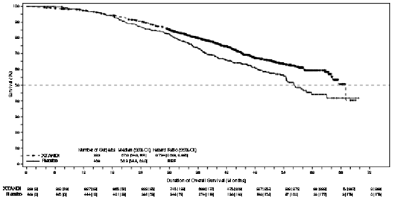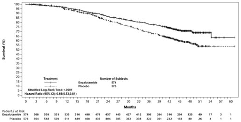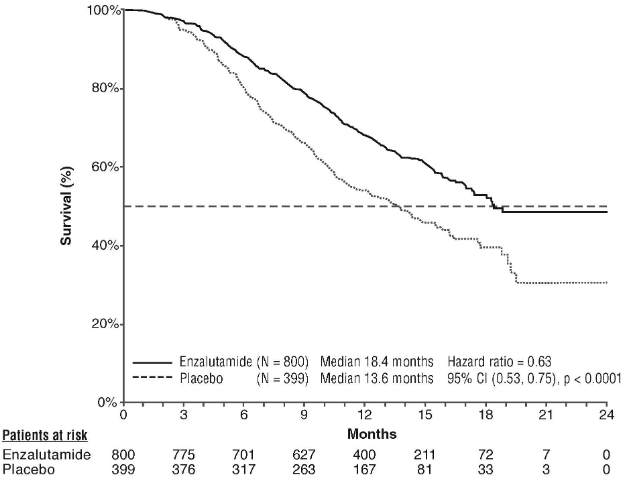 At the pre-specified interim analysis for overall survival when 540 deaths were observed, treatment with enzalutamide demonstrated a statistically significant improvement in overall survival compared to treatment with placebo with a 29.4% reduction in risk of death [HR=0.706 (95% CI: 0.60; 0.84), p<0.0001]. An updated survival analysis was conducted when 784 deaths were observed. Results from this analysis were consistent with those from the interim analysis (Table 5). At the updated analysis 52% of enzalutamide-treated and 81% of placebo-treated patients had received subsequent therapies for metastatic CRPC that may prolong overall survival.