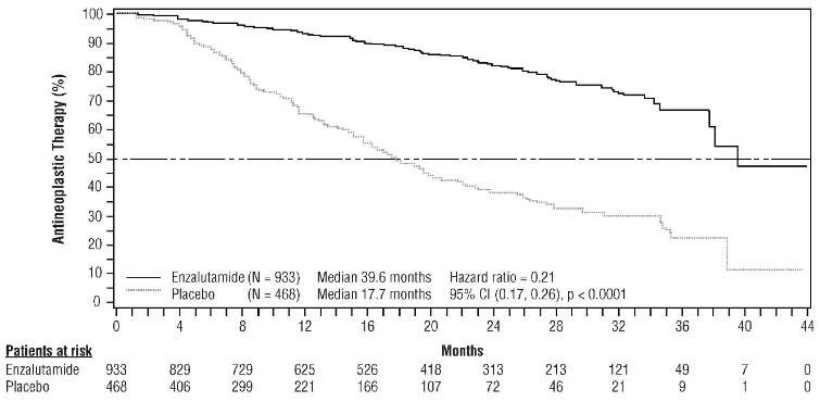 Enzalutamide demonstrated a statistically significant delay in the time to first use of new antineoplastic therapy compared to placebo [HR=0.21 (95% CI: 0.17, 0.26), p<0.0001]. Median time to first use of new antineoplastic therapy was 39.6 months (95% CI: 37.7, NR) on the enzalutamide arm versus 17.7 months (95% CI: 16.2, 19.7) on the placebo arm (see Figure 7).