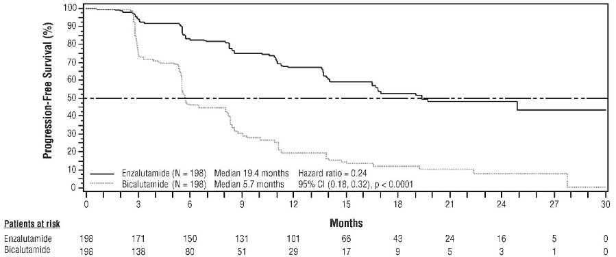The TERRAIN study enrolled 375 chemo- and antiandrogen-therapy naïve patients with metastatic CRPC who were randomised to receive either enzalutamide at a dose of 160 mg once daily (N=184) or bicalutamide at a dose of 50 mg once daily (N=191). Median PFS was 15.7 months for patients on enzalutamide versus 5.8 months for patients on bicalutamide [HR=0.44 (95% CI: 0.34, 0.57), p<0.0001]. Progression-free survival was defined as objective evidence of radiographic disease progression by independent central review, skeletal-related events, initiation of new antineoplastic therapy or death by any cause, whichever occurred first. Consistent PFS benefit was observed across all pre-specified patient subgroups.