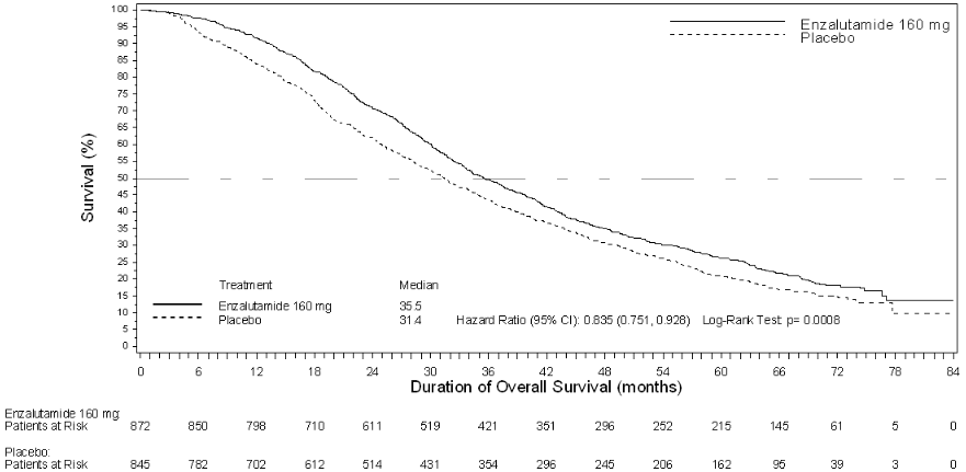 A final analysis of 5-year PREVAIL data showed a statistically significant increase in overall survival was maintained in patients treated with enzalutamide compared to placebo [HR=0.835, (95% CI: 0.75, 0.93); p-value=0.0008] despite 28% of patients on placebo crossing over to enzalutamide. The 5-year OS rate was 26% for the enzalutamide arm compared to 21% for the placebo arm.