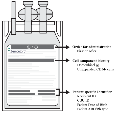 Prescribed number of bags of dorocubicel (1 to 4 bags) and of unexpanded CD34- cells (always 4 bags) must be infused to complete a single dose of Zemcelpro. The total number of infusion bags to be administered must be confirmed with the patient specific information on the RfIC.